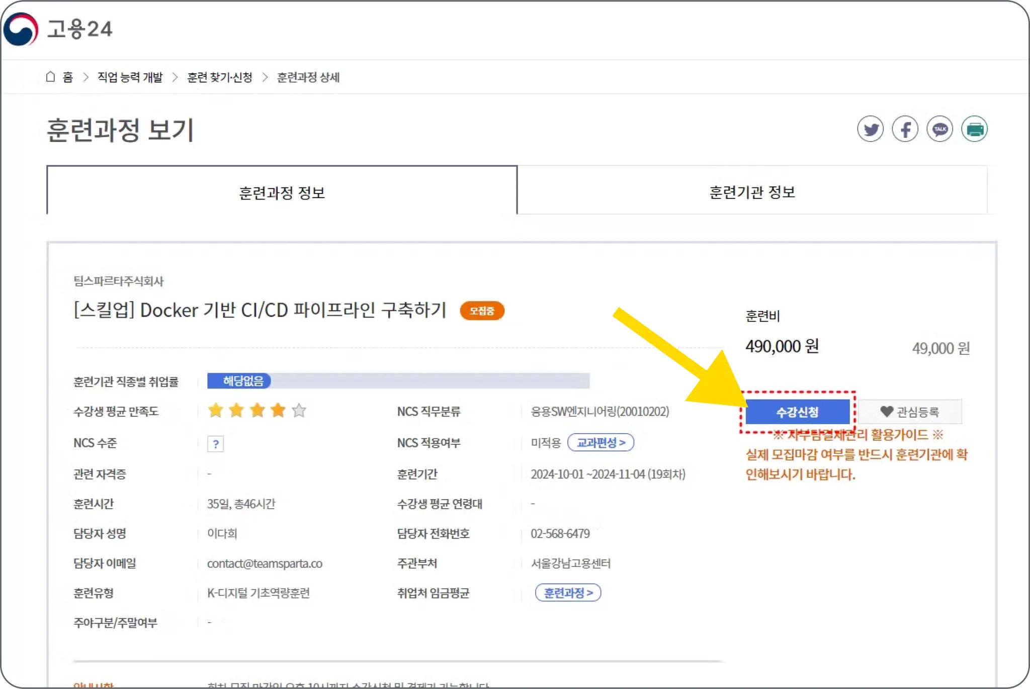 자부담금 결제를 마친 뒤에는 고용24에서 수강신청이 필요해요!