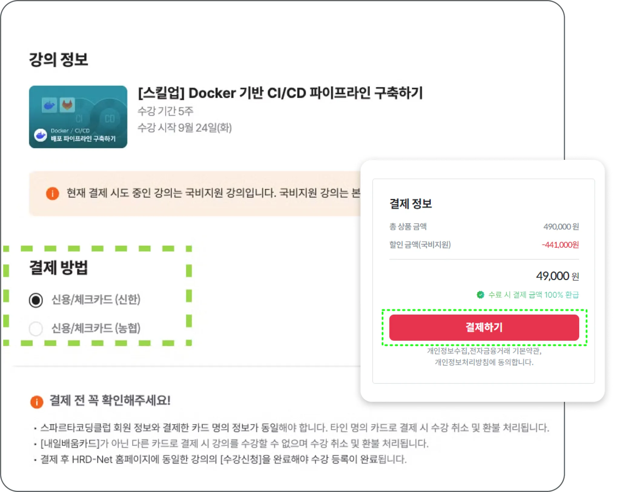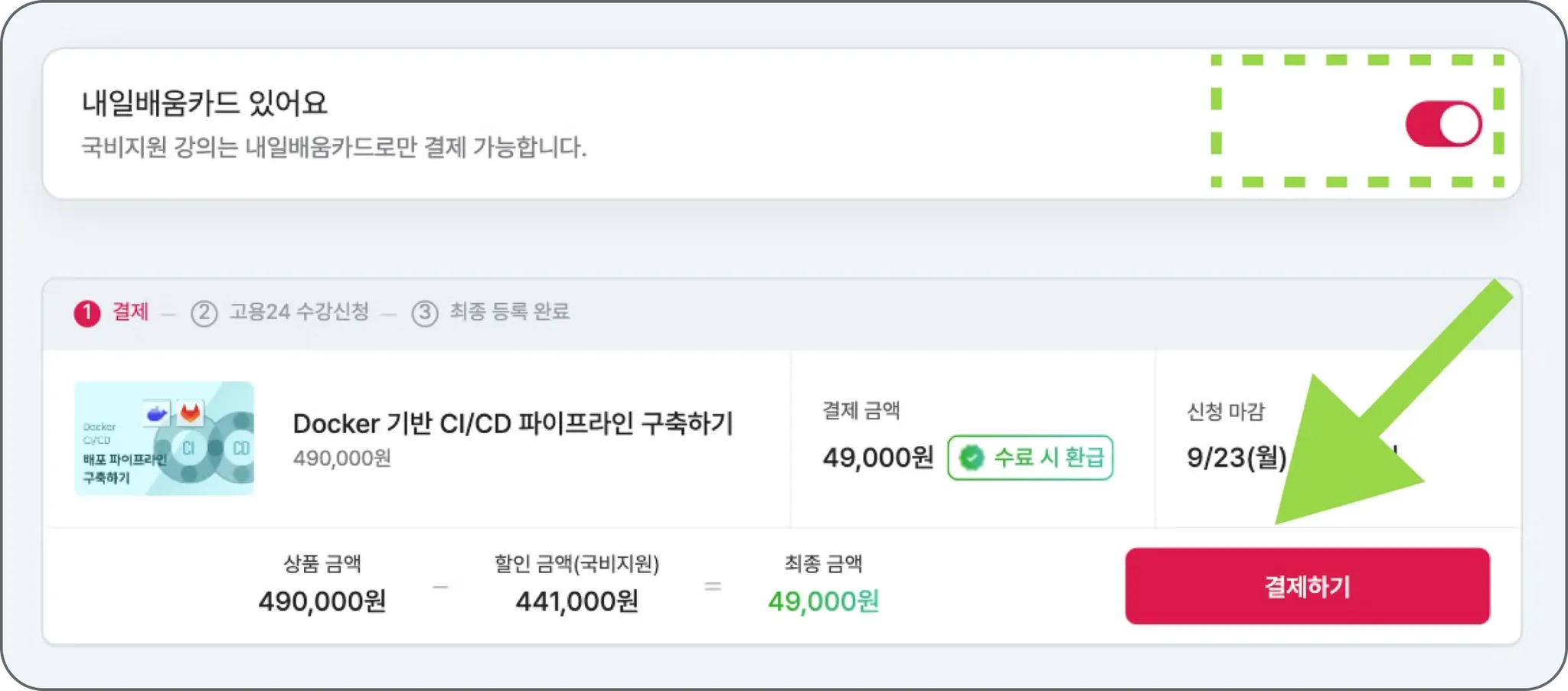이 강의의 원래 비용은 490,000원이지만, 정부에서 441,000원을 지원해주어 내가 결제할 금액은 49,000원이 됩니다.